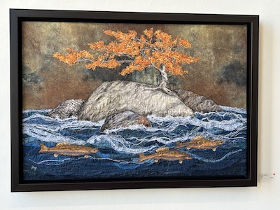 In May, I wrote about a textile art exhibit entitled “Woven Woods,” which my partner and I saw in Almonte. I was so moved by Lorraine Roy’s work that I knew I had to see more and wrote to tell her so. This is how, in late July, we found ourselves heading first to Elora and then to Dundas to see two other of her exhibits – an excursion we were able to combine with time with our youngest grandsons (and their father, of course, but we all know it’s really about the grandchildren) who live in Hamilton.