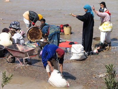In Morocco, we saw clotheslines sharing space with livestock, but we also saw women drying the household laundry by spreading it over nearby bushes and shrubs after having scrubbed it clean on river rocks.